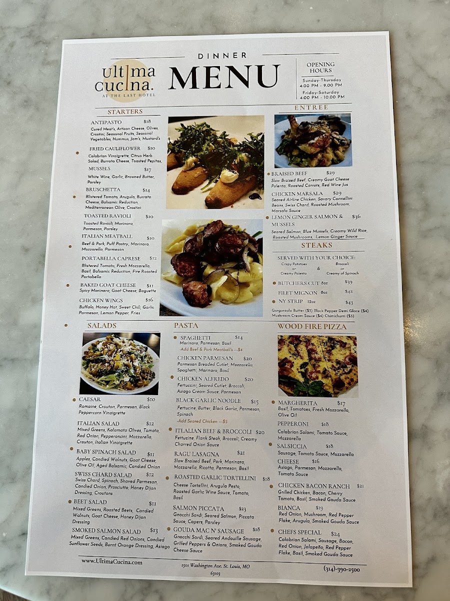 As a reviewer reflecting on the overall menu experience at Ultima Cucina, I find that the selection is thoughtfully curated to showcase comforting Italian-American flavors with broad appeal. The menu opens with approachable starters such as LAST FRIES, CHICKEN CAESAR SALAD, ITALIAN MIXED SALAD, OLIVES, and BRUSCETTA, setting a relaxed tone that works well for sharing or easing into the meal. For something more casual yet satisfying, the hand-held options like the CLASSIC BURGER and COME BACK BURGER provide hearty alternatives for diners craving familiar comfort beyond Italian staples. The heart of the menu lies in the pasta and artisan pizza offerings, where classics like CHEESE PIZZA, MARGHARITA PIZZA, SALSICCIA PIZZA, and PEPPERONI PIZZA highlight simplicity and balance, focusing on well-loved combinations rather than overcomplication. The entrée section reinforces this philosophy with timeless dishes such as SPAGHETTI & MEATBALL, SPAGHETTI MARINARA, CHICKEN ALFREDO, CHICKEN PARMESAN, and CHICKEN PICCATA, all of which feel designed to satisfy a wide range of tastes. Taken together, Ultima Cucina’s menu doesn’t aim to be experimental; instead, it succeeds by offering reliable, crowd-pleasing dishes that feel familiar, comforting, and easy to enjoy-making it a solid choice for both casual diners and groups looking for a dependable Italian-inspired meal in St. Louis.
